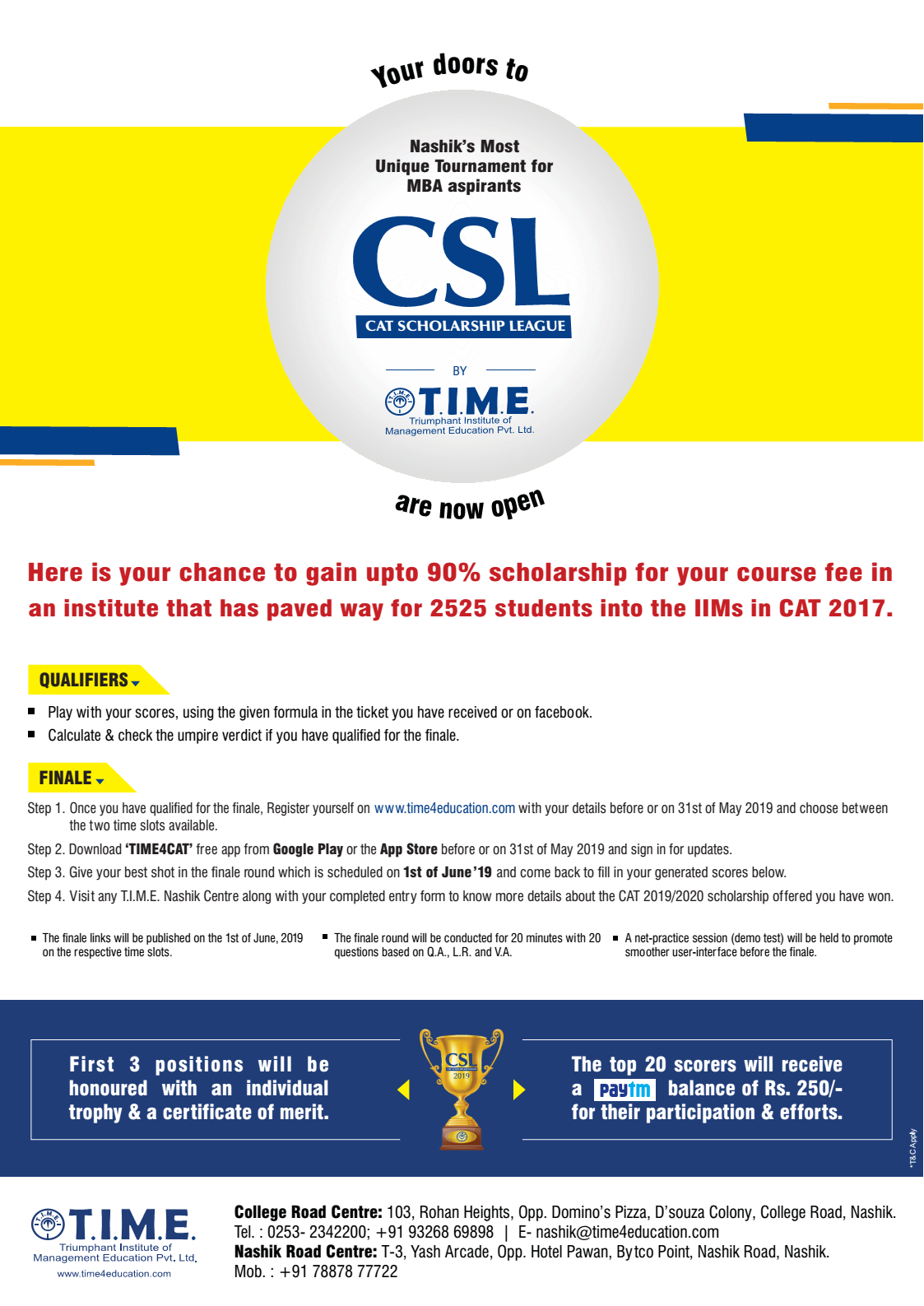 Step 4: Visit any T.I.M.E. Nashik Centre along with your completed entry form to know more details about the CAT 2019/2020 scholarship offered you have won.