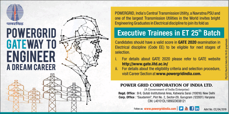 Power Grid has released a notification inviting applications for the post of Engineering Executive Trainees through GATE 2020.
