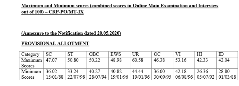 IBPS has also released the maximum and minimum scores (combined scores of CWE Main and Interview out of 100) and total number of vacancies (bank-wise & category wise). In the event of two or more candidates having obtained the same score, the merit order is decided as per date of birth ( candidate senior in age is placed before the candidate junior in age) A list of candidates ( post wise in Registration number order) provisionally allotted will be displayed on IBPS web site on or before 19.06.2020.