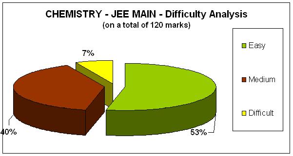 Majority of the questions in the Chemistry part of the JEE Main 2015 are in the range of easy to moderate. The overall difficulty level in this year is less compared to last year. Usually application level questions are expected from Physical and Organic chemistry areas, but this year questions from these two areas were quite straight in nature. But one question from Inorganic Chemistry was based on practical part and it would have been difficult to answer. More over, this year's contribution from Inorganic Chemistry is more compared to previous years.